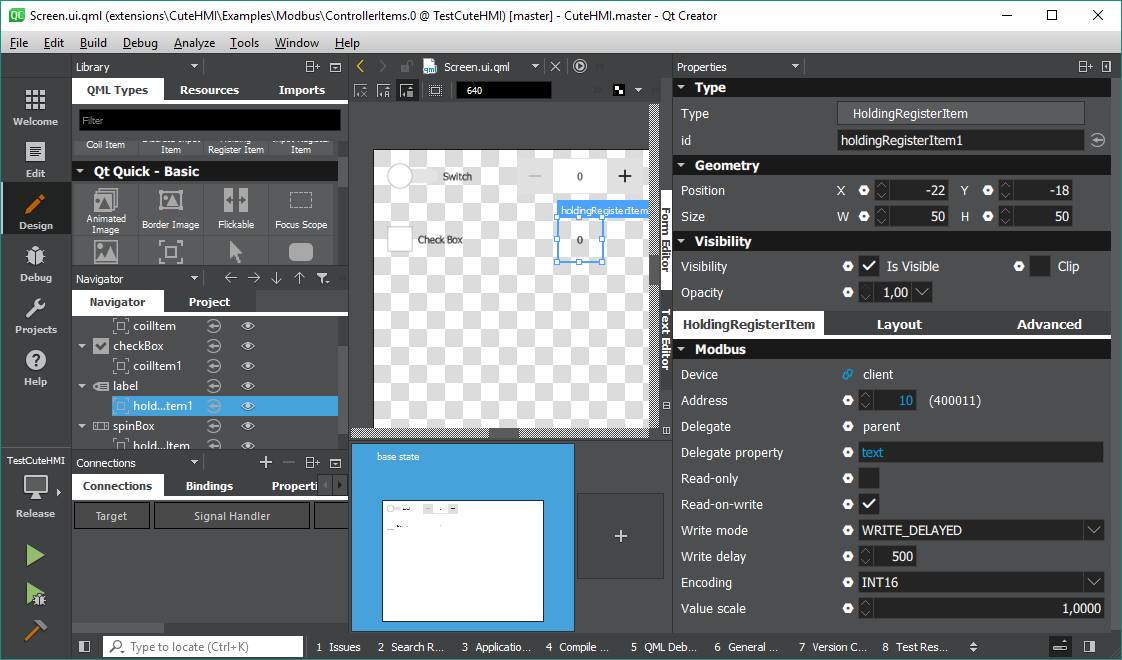 As one can observe CuteHMI.Modbus.CoilItem and CuteHMI.Modbus.HoldingRegisterItem are created as child items of respective Qt Quick controls, which they use as their delegates. Binding is established between controller and specified delegate property.